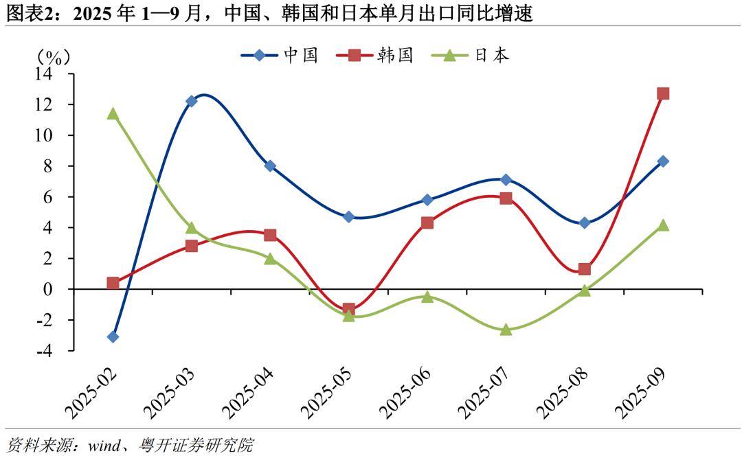 中国出口份额或将进一步增长。中国出口增速虽低于越南,但显著高于韩国、日本等其他主要出口型经济体。2025年前三季度,韩国和日本出口同比分别增长2.3%和2.5%,明显低于中国;越南虽以16%的高增速领先,但由于出口基数较小,对全球贸易总量影响有限。综合来看,预计2025年中国出口占全球出口份额将继续提升,继续巩固其在全球出口竞争格局中的相对优势。