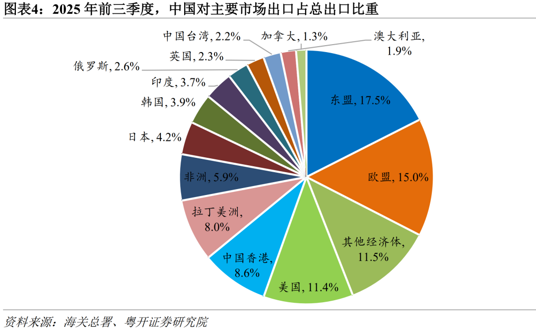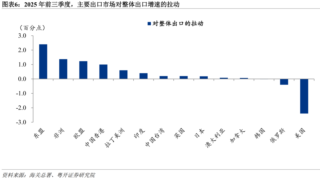 2025年前三季度,在主要出口市场中,中国仅对美国、俄罗斯、韩国的出口同比录得负增长。其中,对美出口受贸易摩擦冲击,同比下降16.9%,拖累整体出口2.4个百分点;对俄出口同比下降11.3%,主要受俄国内经济疲软及去年同期高基数影响;对韩出口同比下降0.3%,与韩国自身经济动力不足有关。与此同时,对非洲、东盟、印度、英国、欧盟、拉美和加拿大等主要市场出口同比均实现显著增长,增速分别为28.3%、14.7%、12.9%、8.7%、8.2%、6.9%和5.1%,合计拉动总体出口增长约6.3个百分点。