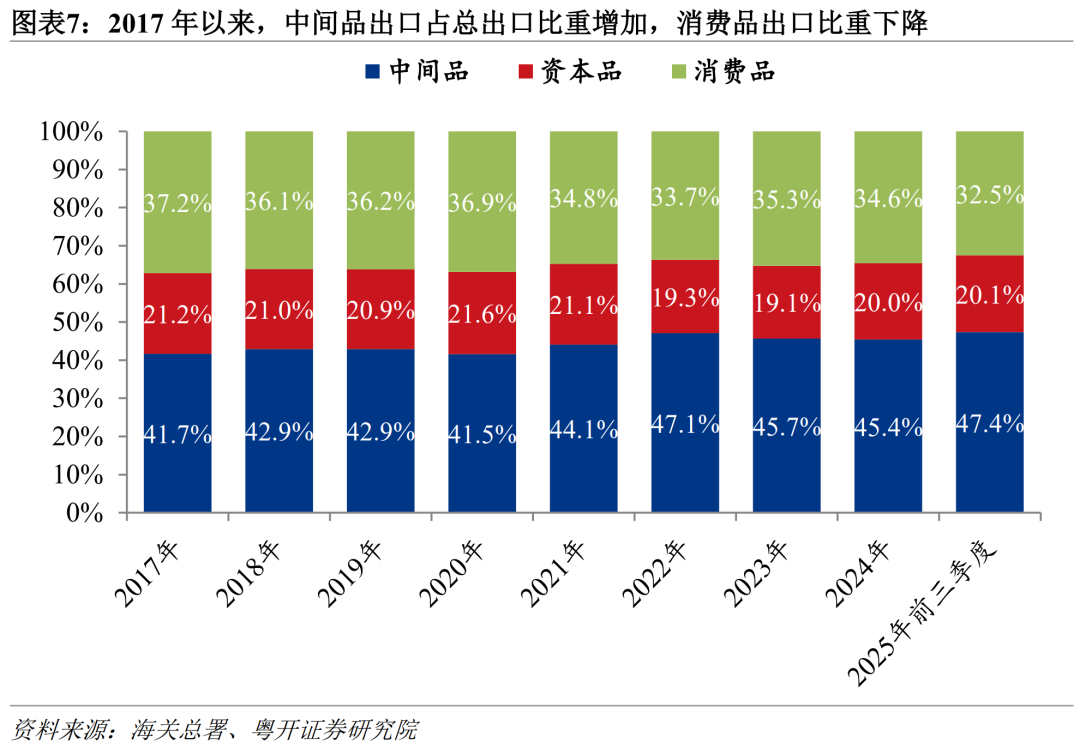 出口的商品结构显著升级。2017—2024年,中间品出口占总出口比重从41.7%升至45.4%,提高3.7个百分点;资本品出口占比从21.2%降至20%,回落1.2个百分点;消费品出口占比从37.2%降至34.6%,回落2.6个百分点。2025年前三季度,中间品出口占比进一步提升至47.4%,消费品占比降至32.5%。