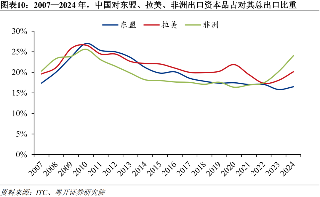 中间品和资本品快速增长,主因产业链承接地和“出海”的中国企业,仍高度依赖从中国进口关键设备和核心原材料。2017—2024年,中国对东盟和拉美出口中间品年均增速分别高达11.6%和11.8%,占对其出口的比重分别上升2.3和1.4个百分点至54.6%和45.9%。