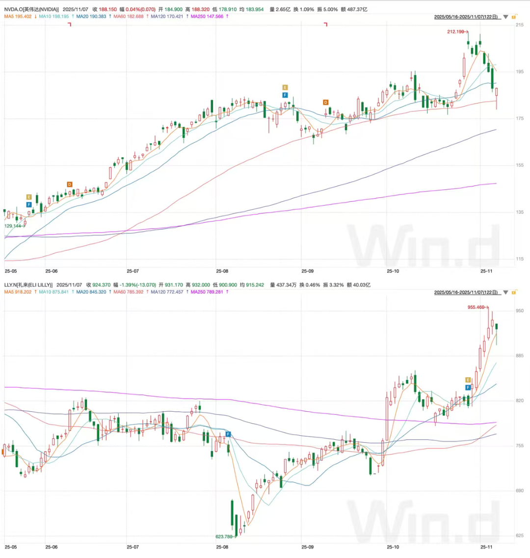 图:英伟达与礼来股价走势;资料来源:wind,36氪