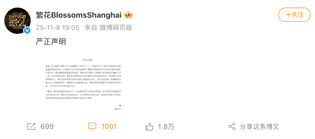 11月8日晚间,@繁花BlossomsShanghai 发布严正声明,回应“古二”录音争议。声明称录音存在大量失实、蓄意剪辑恶意解读的情况,强烈谴责其违法行为,剧组正在持续取证中。原文如下: