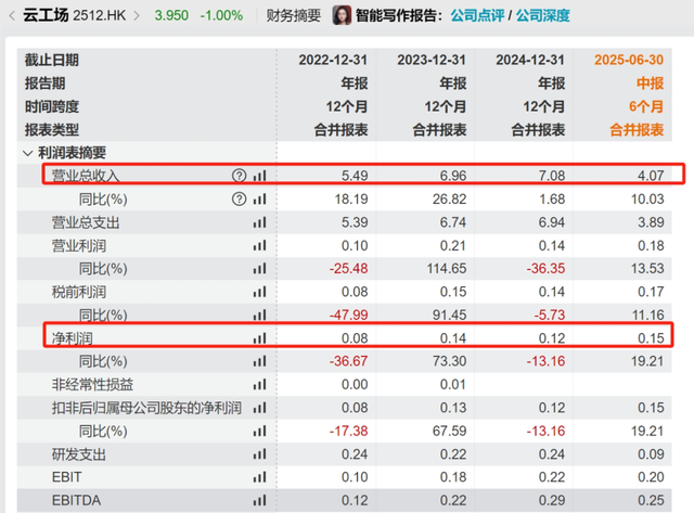据Wind数据显示,2022-2024年及2025年上半年,云工场营收分别为5.49亿元、6.96亿元、7.08亿元,以及4.07亿元;净利润分别为0.08亿元、0.14亿元、0.12亿元,以及0.15亿元