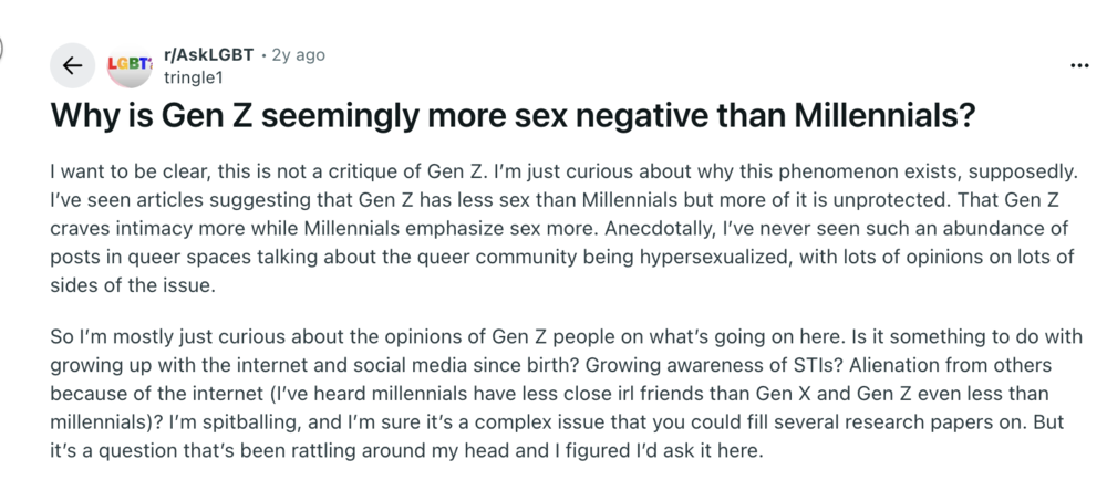 Reddit上的一篇热帖:为什么Z世代比千禧世代对待性更消极?