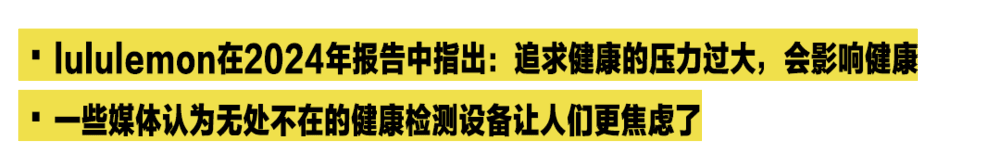 lululemon在2024年报告中发现,尽管人们将健康放在首位,但大众的健康状况并没有得到改善:“不断施加压力以改善我们的健康状况,实际上是在降低我们的健康水平”。