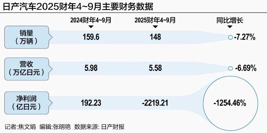 营收方面,日产半年营收缩水6.69%至5.58万亿日元,净亏损更是达到2219.21亿日元,与去年同期192.23亿日元的净利润形成鲜明对比,上演了“由盈转亏”的断崖式下跌。这是日产五年来首次出现半年报亏损。