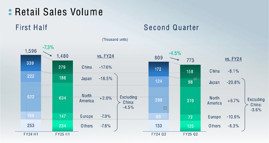 2025财年上半年,日产汽车全球销量从159.6万辆下降至148万辆,同比跌幅7.27%。