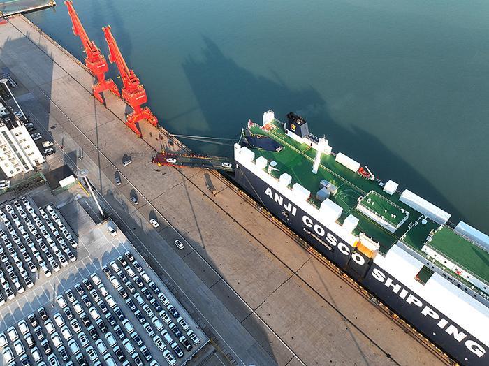 2023年12月2日,在江苏连云港港东方港务分公司码头,滚装轮停靠在59泊位装载汽车出口墨西哥。 视觉中国
