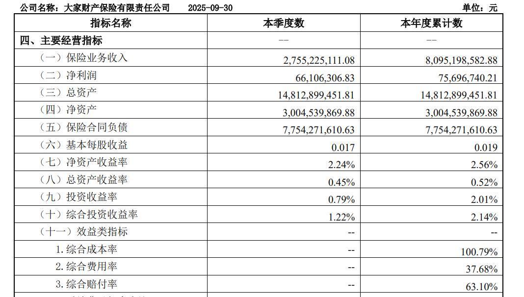经营数据显示,2024年大家保险实现原保费收入1377亿元,连续三年保持千亿规模。但子公司发展呈现分化态势:大家财险2024年首次实现盈利,保费收入80.95亿元,净利润7569.67万元;大家养老则持续亏损,2025年前三季度保险业务收入同比下降2.33%,净利润亏损1.67亿元。这种差异折射出转型期的挑战。