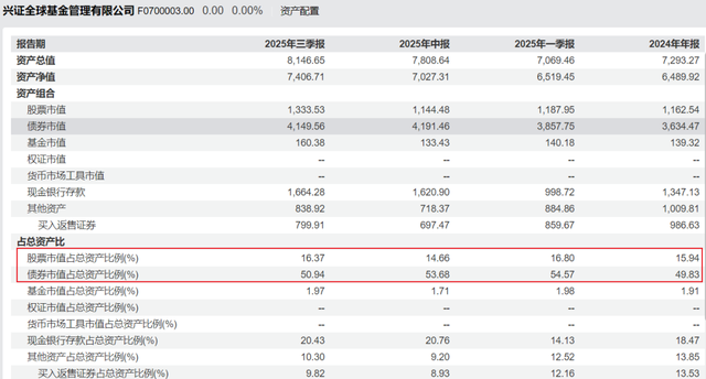 2022 - 2024年期间,兴证全球基金通过增配固收资产以应对权益市场震荡,债券配置比例从42.38%升至49.83%,股票配置比例从23.01%降至15.94%。