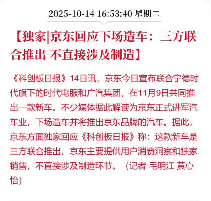 3、京东造车?“双11”发布,刚刚回应:不直接涉及制造环节,每日经济新闻