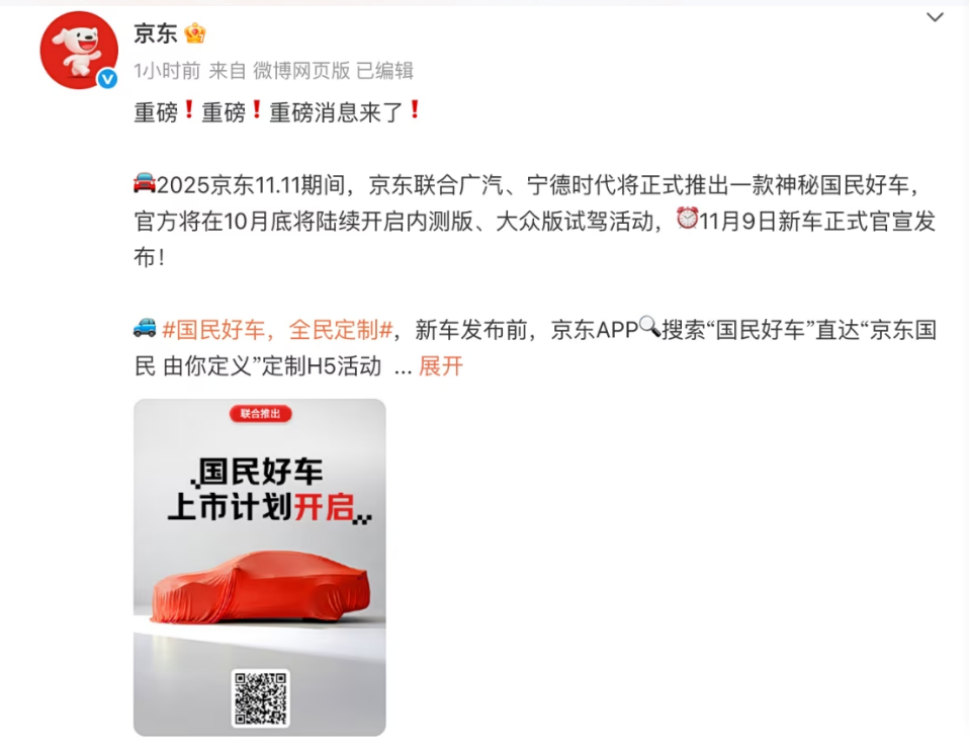 2025年10月,京东“双11”开放日上,一则跨界造车消息引爆汽车圈——京东汽车宣布联合宁德时代旗下时代电服与广汽集团,共同推出首款“国民好车”。这场由互联网大厂发起的造车行动,从传言发酵到正式落地,仅用半个月时间便完成从舆论造势到产品下线的全流程,成为双十一期间最受关注的商业事件之一。