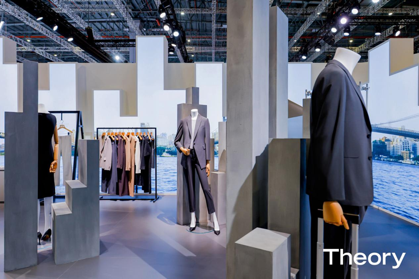 Theory思睿搭建了女装、男装、面料三大展区,并将纽约街景与品牌大事记照片墙引入展馆,提供沉浸式观展路径。展陈聚焦2025秋冬系列,展示从职场到休闲的多场景搭配;工艺区介绍高精度线圈缝纫与版型结构等制作细节。面料区开放触感体验,呈现可追溯羊毛(Traceable Wool)与Motion Wool等材料,围绕来源可追溯、轻薄与便捷护理等特性,说明从通勤到社交的穿着切换方式。