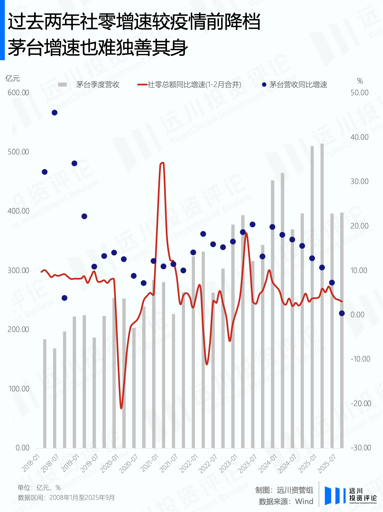 以疫情三年为分界线,剔除其中非典型的波动,近两年国内社会零售总额增速约在4%左右,相比2018年-2019年约8%的增速,降档明显。茅台作为中国高端消费品的代表,曾一度展现出极强的韧性,对所有内外部冲击免疫。然而,这段如梦似幻的繁荣期,也成为了茅台推进渠道体系改革的“削藩”窗口期。