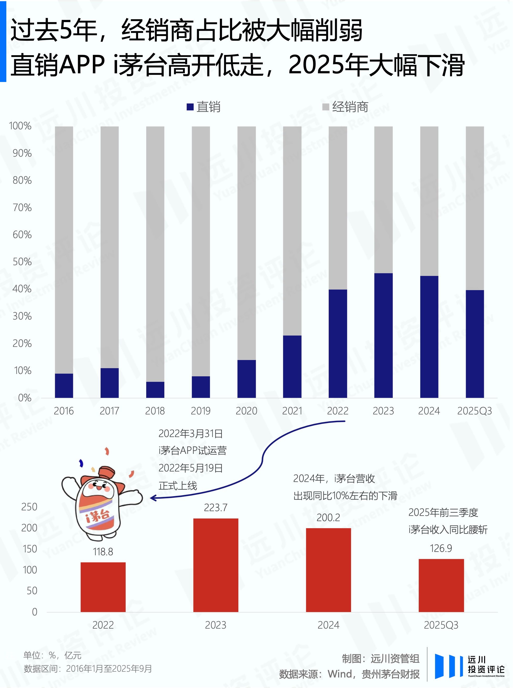 从消费属性来看,茅台在需求端也遇到了不小的麻烦。最新一季财报显示,2025年第三季度茅台营收同比仅增长0.56%,创下十年来最低。官方直销渠道i茅台,今年前三季度也仅卖出127亿元,较去年同期腰斩有余。这一数据无疑给茅台的未来发展蒙上了一层阴影。