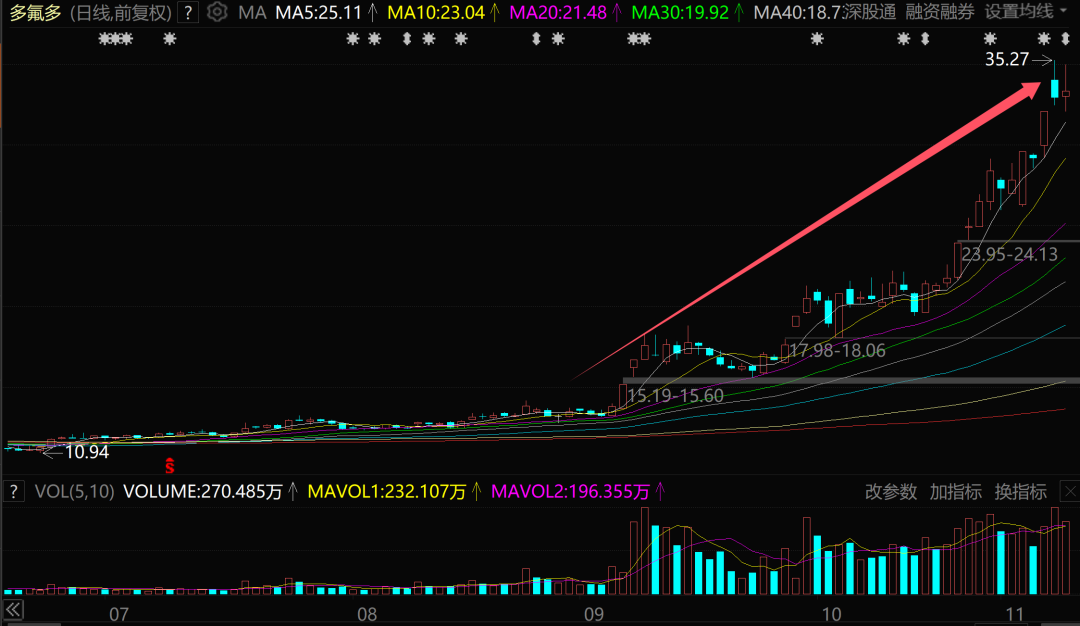 作为新能源材料领域的标杆企业,多氟多(002407.SZ)近期成为市场焦点。该公司股价自9月初的13元附近启动,截至11月中旬已突破35元,两个多月累计涨幅达167%,远超同期大盘表现。