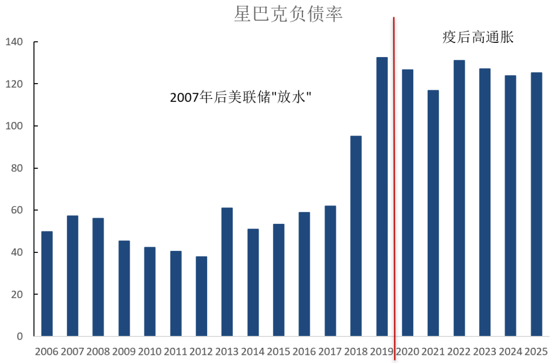 另一方面,星巴克期间累计的资本支出则达到202.57亿美元,那么,资本支出的钱从何而来?答案是借款,FY2015-FY2025星巴克累计净债务增加142.17亿美元,资产负债率从2015年的53.24%飙升至2025财年的125.26%。