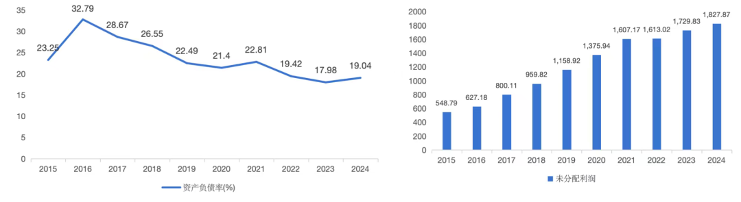 资金需求低+巨额留存收益加持,2025年三季度资产负债率仅12.81%。公司仅存的有息负债是贵州茅台旗下财务子公司采用类似银行方式,吸收的来自控股股东茅台集团等各个关联方存放的资金,该笔资金也并非贵州茅台自用,而是继续向关联方等提供贷款业务。财报数据显示,截至2025年三季度,贵州茅台吸收存款及同业存放(类似吸储)金额约为145亿元,同时拆出资金(类似放贷)1354亿元。