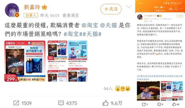 11月10日,拥有1962万粉丝的明星刘嘉玲发布控诉微博,直指双11期间某店铺严重侵权其丈夫梁朝伟的肖像权,涉嫌欺骗消费者。这条微博迅速登上热搜,引发大V和网友的广泛支持。