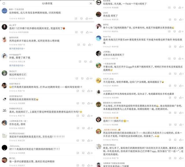 无独有偶,11月9日第一财经报道称,双11期间跳转广告成为困扰用户的主要难题。杭州市余杭区市场监督管理局证实已收到相关举报,并交由网监分局展开调查。