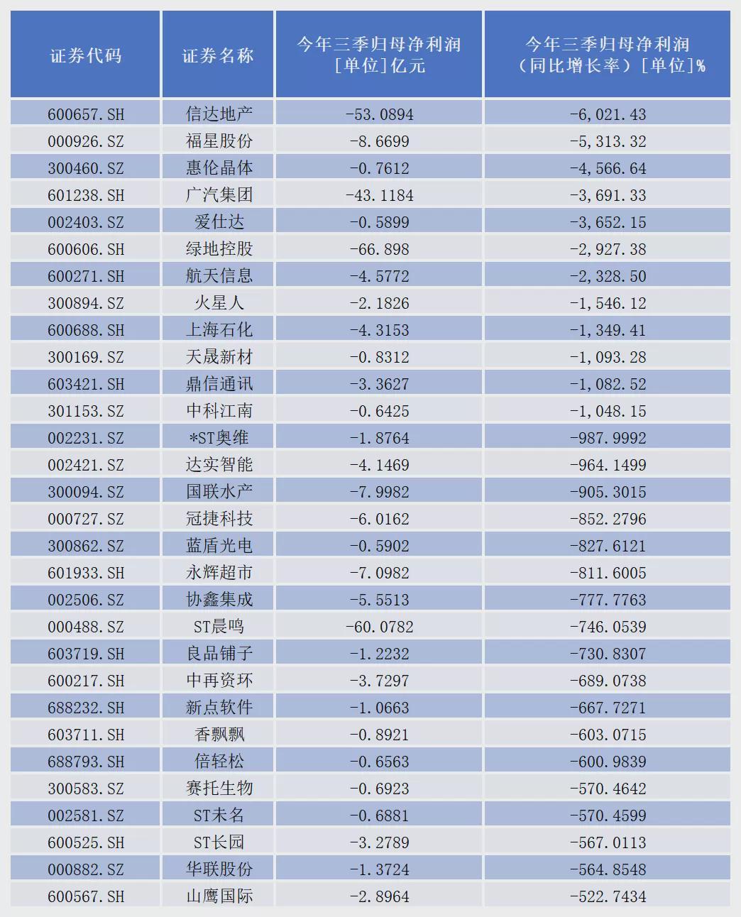同花顺iFinD显示,前三季度,在上述544家上市公司中,归母净利润亏损同比扩大超500%的共有30家上市公司。