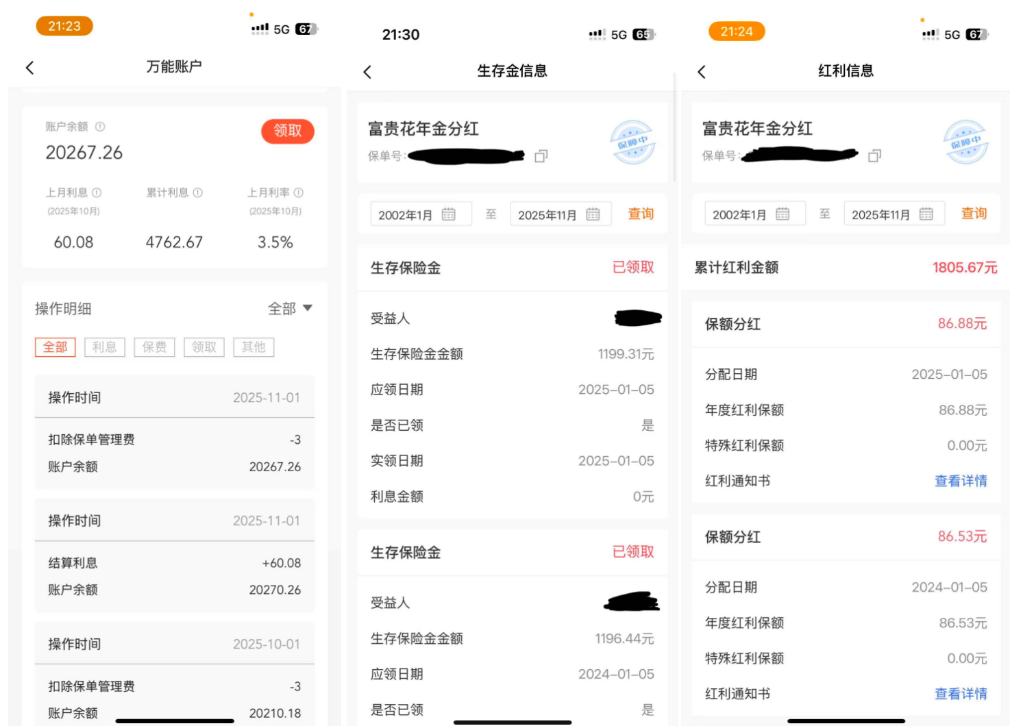 “这份合同期限长达73年,要到我81岁时才终止,这种超长期产品完全不符合我们家庭的真实需求。”李荔表示,销售人员当时承诺的是10年之后会返本加利息,这显然是不可能的。目前,这份保单每年产生不到1200元年金和数十元分红,加上万能账户(复利计息,年利率3.5%)的收益,年收益约1800元。值得注意的是,李荔提供的红利信息截图显示,2013年至今,该保单累计红利金额仅有1805.67元。