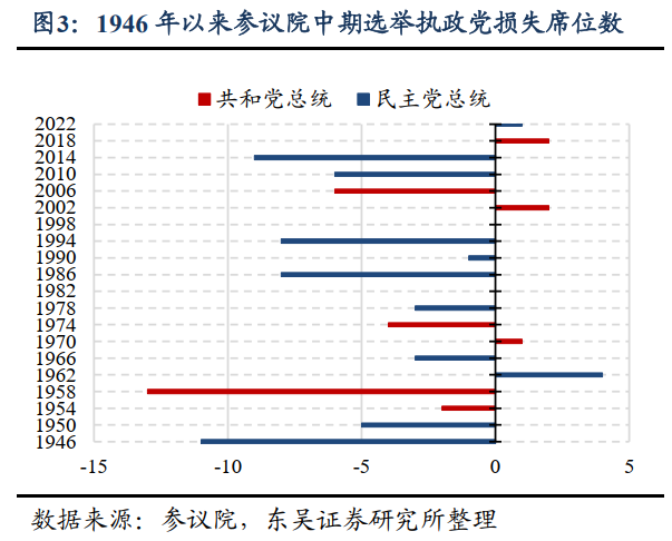 然而,面对中期选举这一“期中考试”,“考生”们给出的“答卷”似乎都不甚理想:失利已是历届总统在中期选举中的常态,因此中期选举也被称作执政党的“中选魔咒”。回顾二战结束后的20次中期选举(1946-2022),总统所在的执政党在众议院、参议院平均要失去25.7席、3.3席。这20次中期选举中,执政党未丢掉众议院、参议院多数党优势的次数分别仅有5次、8次。对于在大选中实现横扫(同时拿下白宫、众议院、参议院)的11位美国总统而言,在次年的中期选举中丢掉众议院、参议院多数党优势的分别有7、4位,同时丢掉众议院、参议院多数党优势有4位,而同时保住众议院、参议院多数党优势仅有4位,即延续横扫优势的概率只有36.36%。
