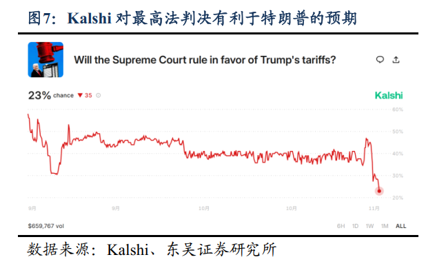 今年5月,美国国际贸易法院裁定特朗普依据国际紧急经济权利法(IEEPA)征收对等关税不符合法案本身内容,特朗普随后一路上诉至最高法院。11月5日,美国最高法院将就该案进行了口头辩论,随后法院将举行闭门会议对案件进行初步投票和讨论,并撰写多数派意见书。由于总统绕过国会授权,依据IEEPA无限制加征关税这一行为违反了三权分立这一美国政治制度设计的核心价值观,因此虽然当前最高法的9位大法官中有6位由共和党总统提名、其中3位更是由特朗普本人提名,但当前市场仍预期最高法院大概率将裁定IEEPA关税违法。而在最高法院口头辩论后,博彩网站Kalshi与Polymarket分别预测最高法院对IEEPA的裁决有利于特朗普的概率仅有23%、25%。
