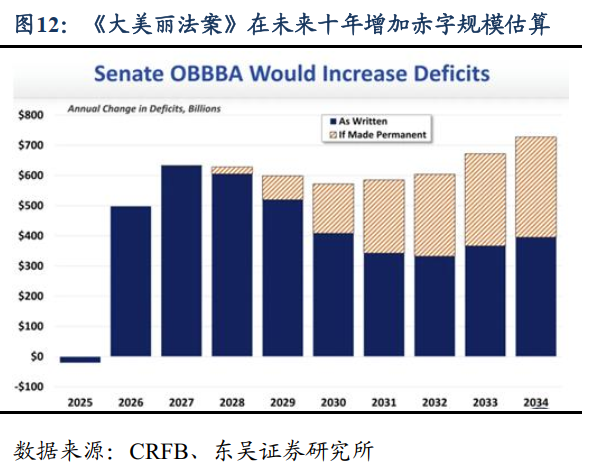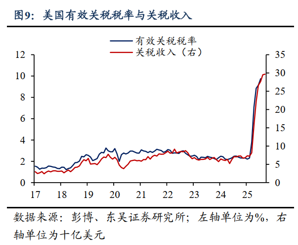 ③创造收入:关税带来的收入能一定程度缓解其宽财政导向面临的压力。根据美国财政部的最新数据,今年1-9月美国关税总收入达到约1740亿美元,较去年同期的580亿美元翻了近三倍。若明年特朗普再度升级关税冲突,则关税收入数字或进一步增加。由于特朗普面对中期选举仍需要交出一份亮眼的经济表现“答卷”,而今年通过的《大美丽法案》存在“增赤在前,减赤在后”的特点(详见报告《》),因此关税收入的增加能一定程度上减少明年美国联邦政府的赤字压力,从而为“宽财政”提振经济表现提供更多空间。