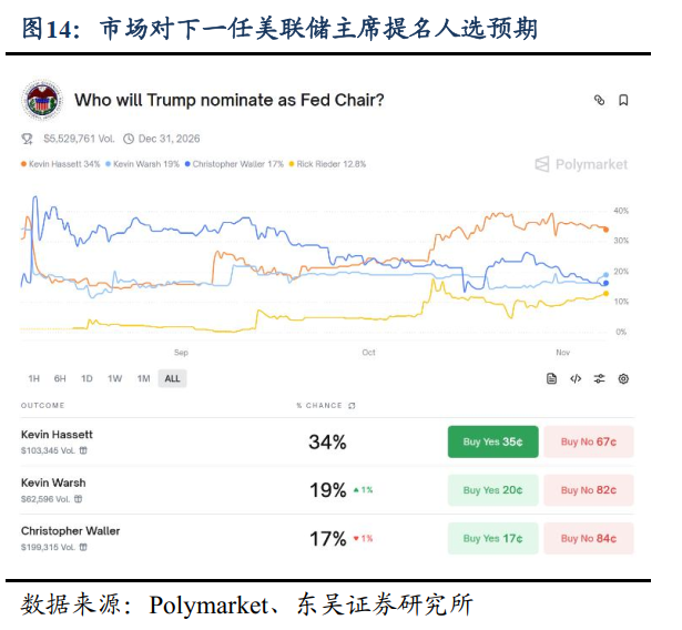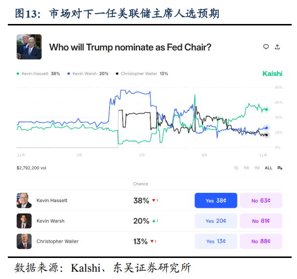 现任美联储主席鲍威尔任期即将于明年5月15日结束,因此提名一位提名于自己的美联储主席,成为目前特朗普干预美联储独立性,实现更加鸽派货币政策的最优解。从任命节奏上看,目前美国财政贝森特已经完成了第一轮的候选人面试,对特朗普而言,“忠诚”将是其考量提名人选的关键要求——特朗普希望新美联储主席能够落地其低利率的诉求。同时,为了避免重蹈任命鲍威尔的“覆辙”,确保候选人正式就任后仍能够维持鸽派立场,特朗普需要寻找既能让他信任、又在政治上对其握有一定制衡手段的人选。例如,若特朗普握有候选人的“政治把柄”,则其可以通过行政和法律等手段(参考特朗普以涉嫌在抵押贷款申请中存在欺诈行为为由罢免美联储理事库克),在候选人就任后对其形成政治压力,以避免其转换政策立场。结合现有信息判断,哈赛特在特朗普首任任期内便作为顾问参与减税法案(TCJA)和“美国制造”等政策理念的设计,其对特朗普经济理念的熟悉和认可程度使得其相较其他候选人更具优势,而其在本届政府中依旧担任重要经济政策制定的职务也从侧面反映了特朗普对其本人在政治层面上的信赖。同时哈赛特作为候选人中唯一在政府任职的“白宫系”代表,也被认为在政治上更易协调财政与货币政策,能够与特朗普合作良好并执行其“降息”理念(详见报告《》)。哈赛特目前在博彩市场的当选概率也远超其他候选人(图13-14)。向前看,我们预计特朗普将在今年12月公布最终候选人,于明年1月正式提名并移交参加参议院进行听证会审核,并最终于明年5月正式上任,最早可参加明年6月17日的FOMC会议。