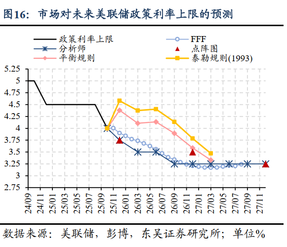 当前市场与美联储目前对明年降息预期仍存在一定分歧:①分析师:10月24日彭博调查问卷显示,分析师一致预期美联储12月仍将降息1次,26Q1、26Q3各降息1次,即当前至明年底累计降息3次。②交易员:截至最新联邦基金期货交易员定价12月降息概率68%,到明年底累计降息3.4次。③美联储:9月FOMC会议点阵图指引今年全年3次降息,明年1次降息,即当前至明年年底降息2次。另外,如果我们用平衡美联储通胀和增长目标的定量分析来看,泰勒规则指引明年年底政策利率上限在3.6-3.8%,对应1-2次降息。