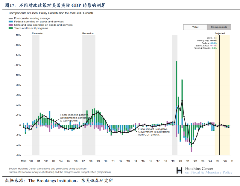 虽然2025年特朗普落地了《大美丽法案》以支撑经济,但根据研究机构Hutchins Center模型预测,25Q3-26Q4美国财政脉冲(四个季度平滑)分别为-0.12→-0.29→-0.05→+0.09→-0.01→-0.08%。Hutchins Center认为,2026财政脉冲平均为-0.1%,虽然《大美丽法案》能带来0.3%的GDP增长,但结合关税的-0.4%的拖累,最终将是负贡献。