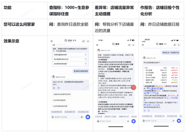 生意管家“大促AI助理”不仅具备数据、营销、客服等Agent能力,更为商家提供大促不同阶段经营解读,诊断经营流失风险及挖掘平台机会。