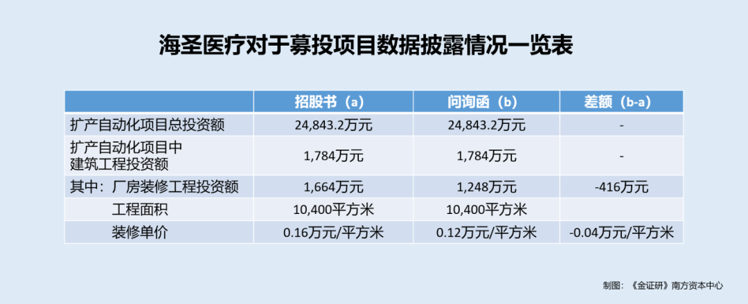 经测算,对于“扩产自动化项目”的厂房装修工程总投资额数据,海圣医疗招股书披露的数据比在二轮问询回复披露的数据多416万元。