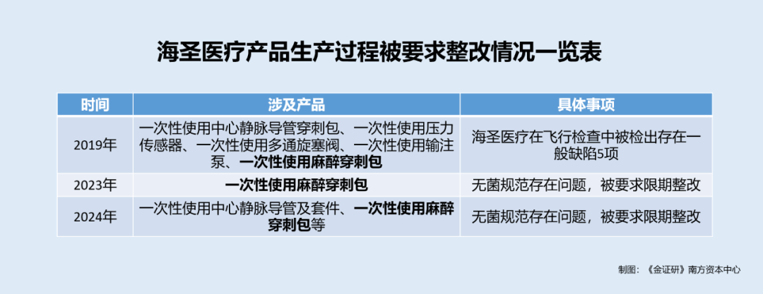 由上可知,海圣医疗的产品“一次性使用麻醉穿刺包”的核心工序包括“灭菌及EO解析”。而回溯历史,2019年,在飞行检查中,海圣医疗的企业生产管理体系存在5项一般缺陷,检查产品包括一次性使用麻醉穿刺包。2023-2024年,海圣医疗的“一次性使用麻醉穿刺包”产品连续两年的无菌规范遭限期整改。