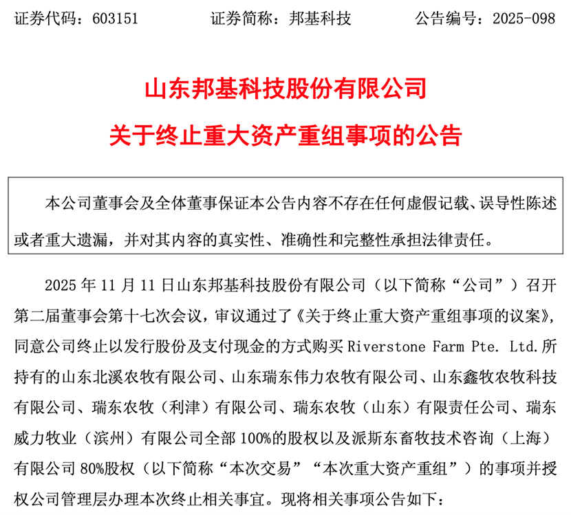 回顾此次终止的重大资产重组事项,其始于2025年6月。邦基科技原计划通过发行股份及支付现金的方式,收购Riverstone Farm Pte. Ltd.所持有的山东北溪农牧有限公司、山东瑞东伟力农牧有限公司、山东鑫牧农牧科技有限公司、瑞东农牧(利津)有限公司、瑞东农牧(山东)有限责任公司、瑞东威力牧业(滨州)有限公司全部100%的股权以及派斯东畜牧技术咨询(上海)有限公司80%股权。