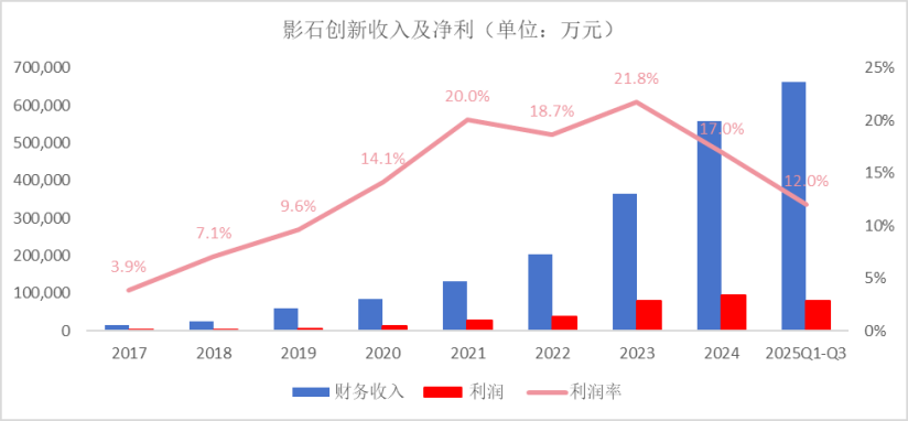 2025年前三季度,影石财报的关键词是增收不增利。公司累计营收66.1亿,同比增长67.2%。和收入数据相比,盈利数据则有一定波动:公司三季度净利润7.92亿,同比下降6.0%。
