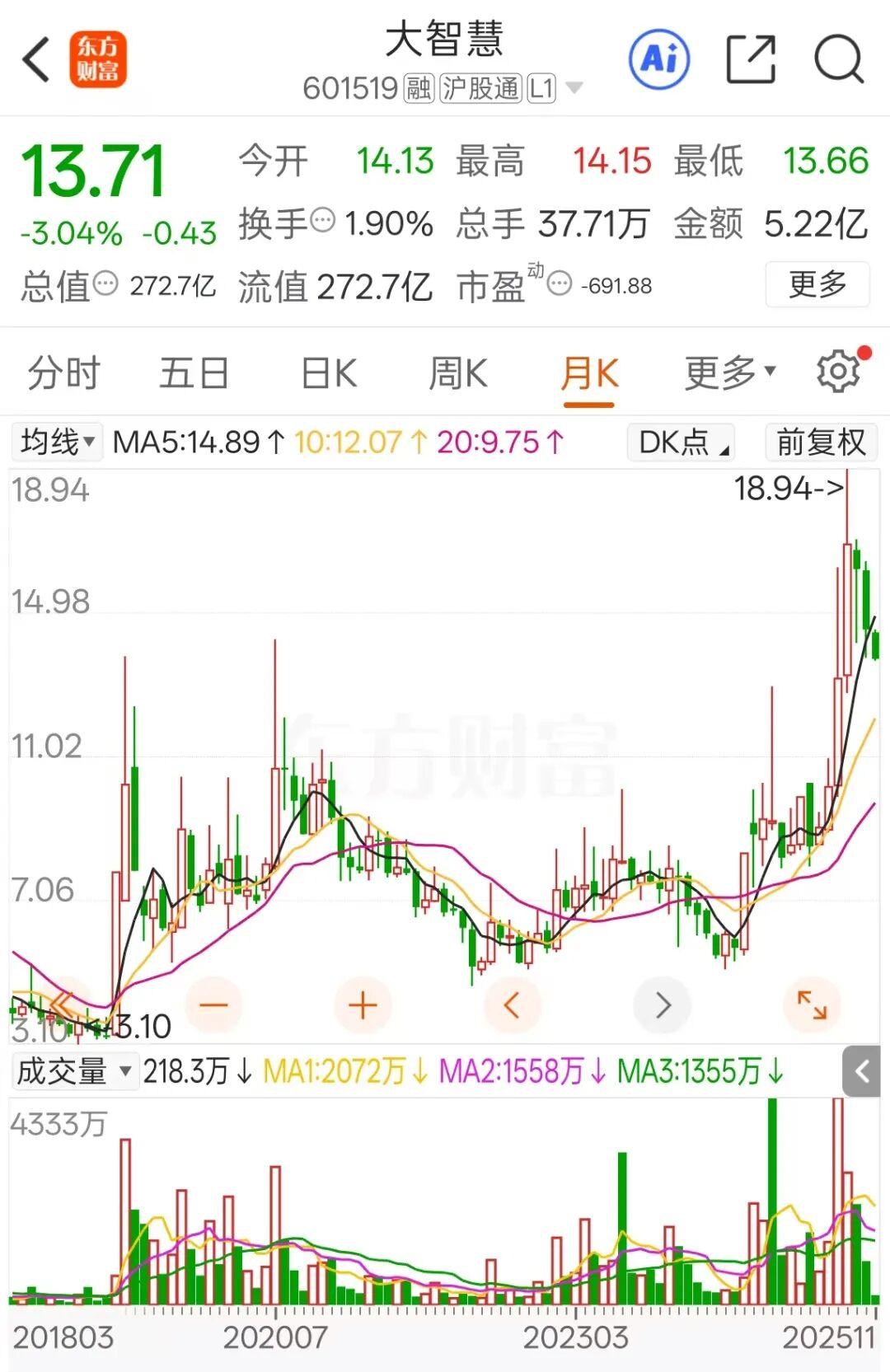 截至2025年11月11日收盘,大智慧最新市值为272.7亿元。