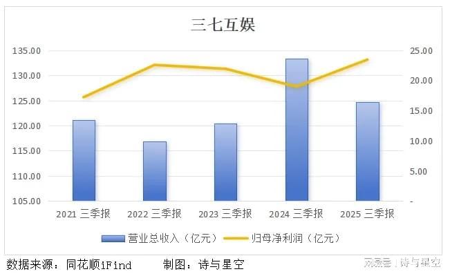 今年前三季度,三七互娱实现营收124.61亿元,同比减少7%;归母净利润为23.45亿元,同比增加24%。这并不是因为今年业绩增幅较大,而是因为2024年同期归母净利润跌落谷底。