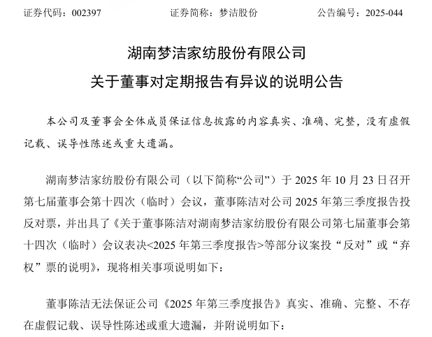 然而,梦洁股份公告称,梦洁股份的董事陈洁表示无法保证报告真实、准确、完整、不存在虚假记载等。值得关注的是,陈洁自2023年2月份开始担任梦洁股份的董事,已经连续对公司2023年至2025年发布的定期报告以及多项议案投出反对票或者弃权票。