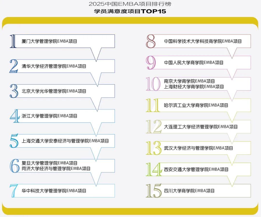 荣获今年主榜前15位EMBA项目依次为:清华经管EMBA项目、北大光华EMBA项目、浙大EMBA项目、上海交大安泰EMBA项目和中国科学技术大学科技商学院EMBA项目(并)、厦大EMBA项目和同济经管EMBA项目(并)、复旦EMBA项目、华科大EMBA项目、上海财大EMBA项目、南京大学EMBA项目、哈工大EMBA项目、大连理工EMBA项目、西安交大EMBA项目、人大EMBA项目、武大EMBA项目、华南理工EMBA项目。