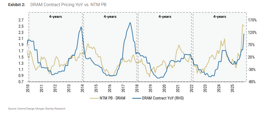 另一方面,大摩表示,随着DRAM合约价格飙升,供应商掌握了史无前例的定价权。