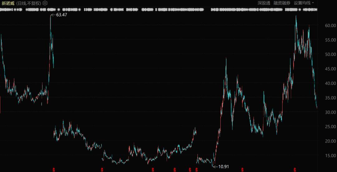 在业绩不振的同时,新诺威股价经历了大幅波动。在创新药板块普遍反弹的背景下,新诺威股价从2025年年初的20多元,一度暴涨至最高63元,如今又大幅回调接近50%。
