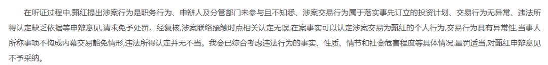 此外证监会的处罚决定显示,甄红认为交易行为是“职务行为”“属于事先订立的投资计划”。