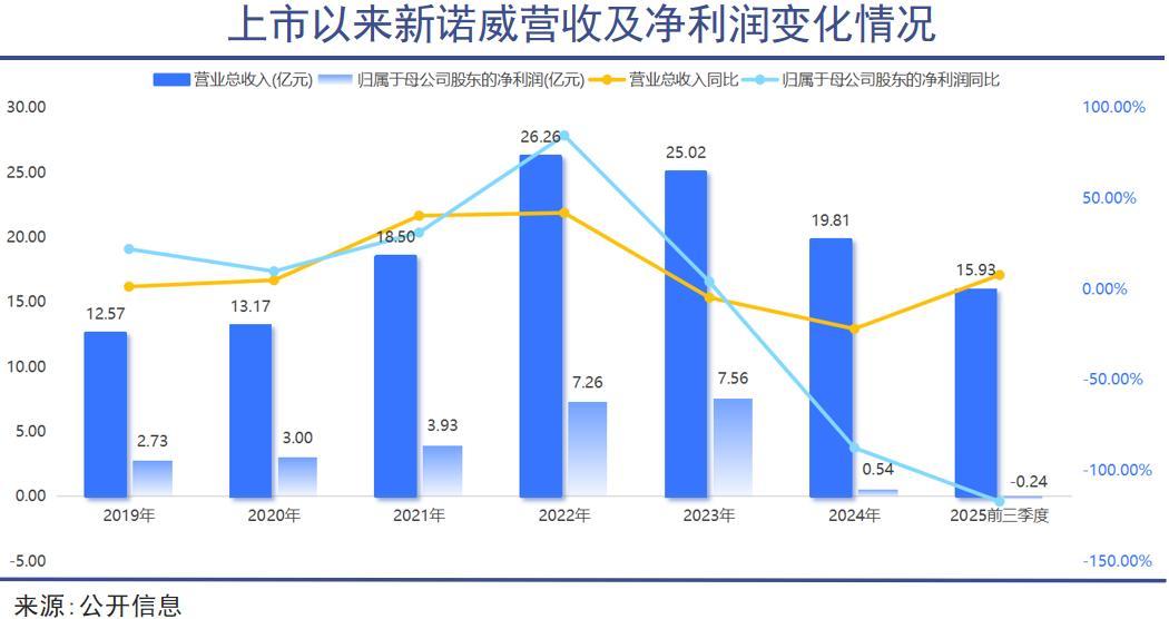 进入2025年,这样的趋势并未扭转。前三季度新诺威的营业收入为15.93亿元。归母净亏损2405万元,同比下降117.3%;扣非归母净亏损6482万元,同比下降147.4%。这也是公司首次在三季报中出现亏损。