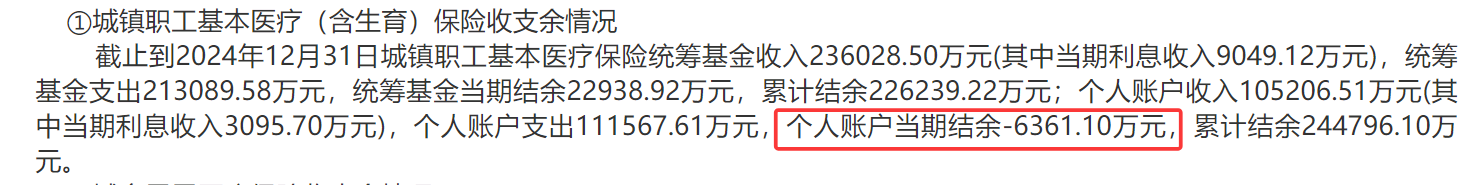 但新乡市医保局说的这个“套刷”情况,可能真的存在。2024年新乡市职工医保个人账户当期结余为-6361.10万元,竟然为负数,这说明很多人觉得医保不用就浪费了,还有人听说不用的话,就会清零。所以,本来没需求,也跑去刷医保,导致医保基金消耗很大。