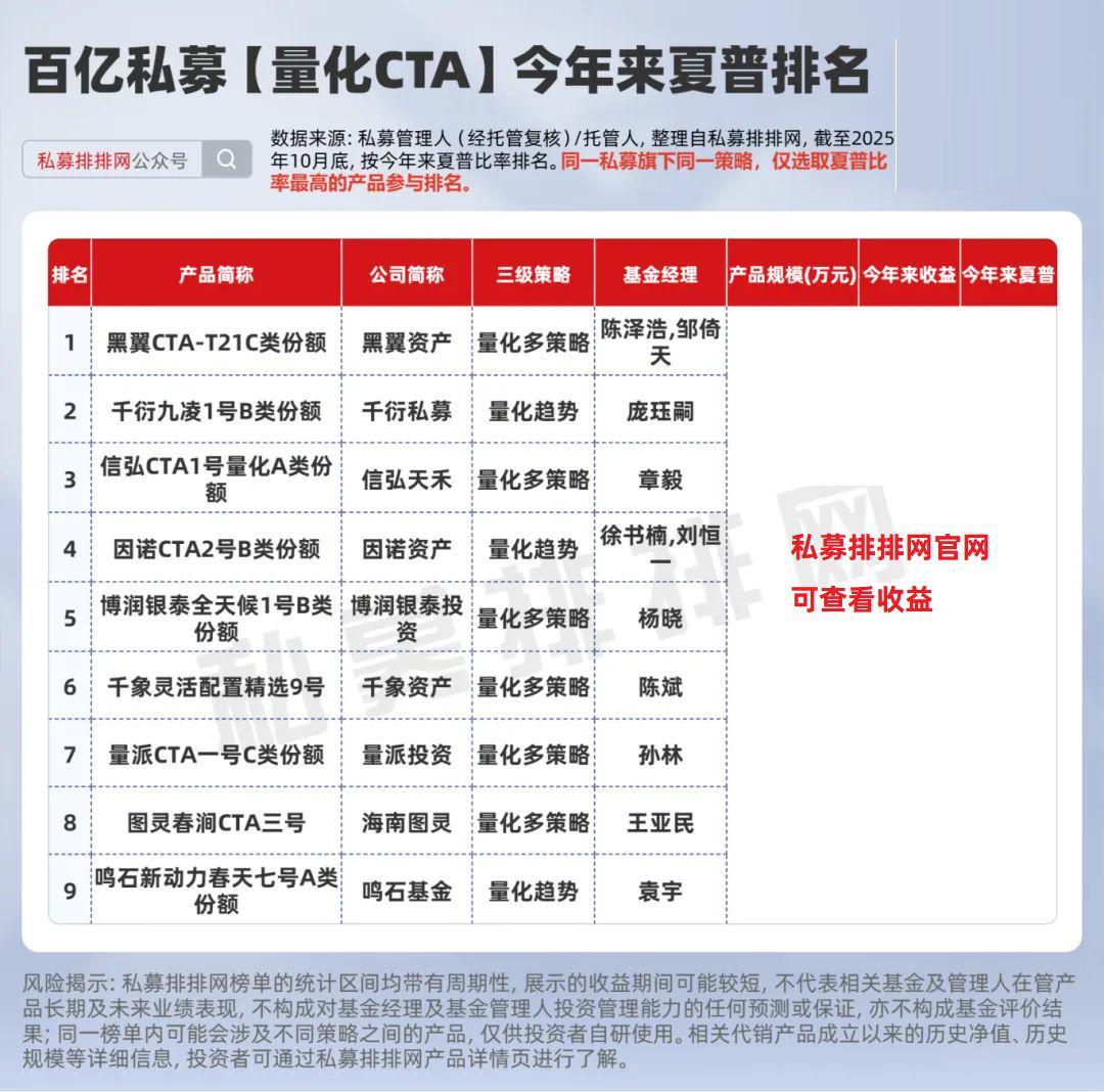私募排排网数据显示,截至10月底,百亿私募旗下25只量化CTA产品今年来收益均值为7.01%,今年来夏普均值约为1.08。今年来夏普比率居前量化CTA产品分别来自:黑翼资产、千衍私募、信弘天禾。