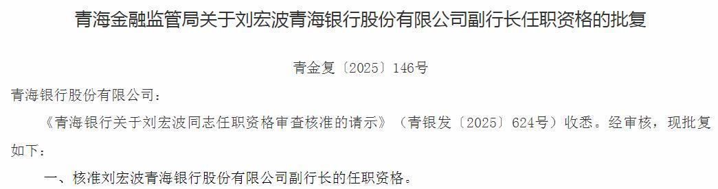 “青海金融监管局批复,核准了应海峰青海银行董事长,吴存寿青海银行行长,刘宏波青海银行副行长的任职资格。”