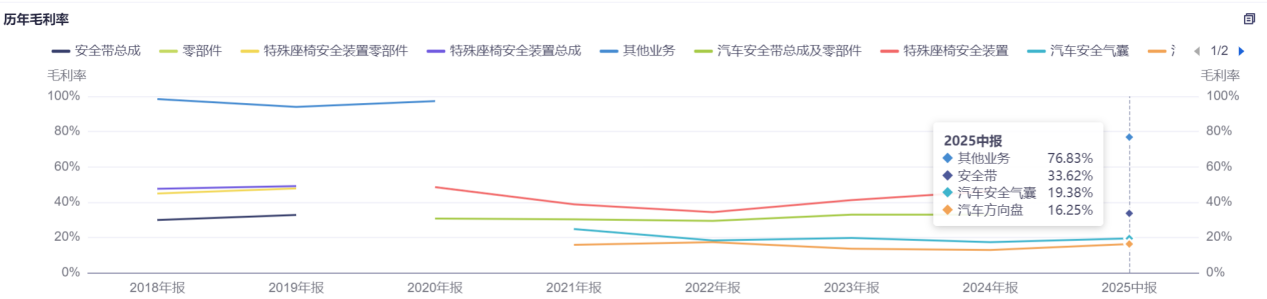 从2025年上半年收入结构来看,汽车安全带、安全气囊和方向盘为公司三大核心品类。其中,安全带仍是其支柱业务,收入占比近六成;安全气囊位居第二,贡献近26%的营收;方向盘业务占比近13%。
