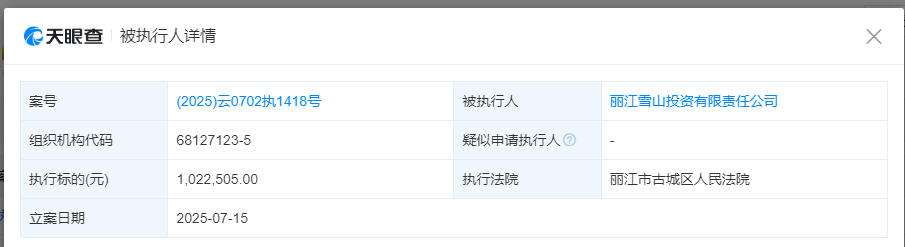 今年7月15日,雪山公司新增1条被执行人信息,被执行总金额约102.25万元,执行法院为丽江市古城区人民法院。风险信息显示,该公司已被限制高消费,并存在多条股权冻结信息。